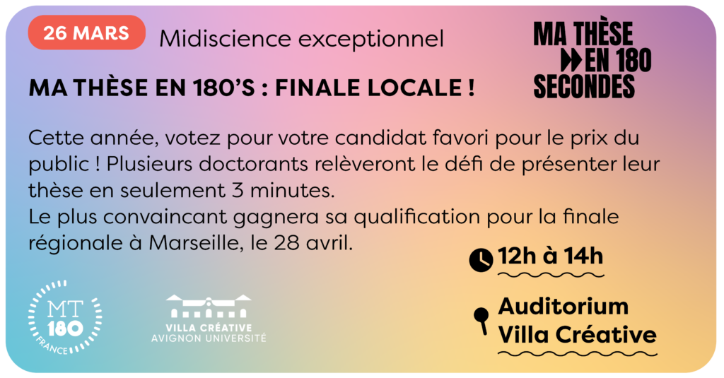 - 26 MARS : Midiscience exceptionnel : Ma Thèse en 180 secondes, sélection locale – de 12h à 14h