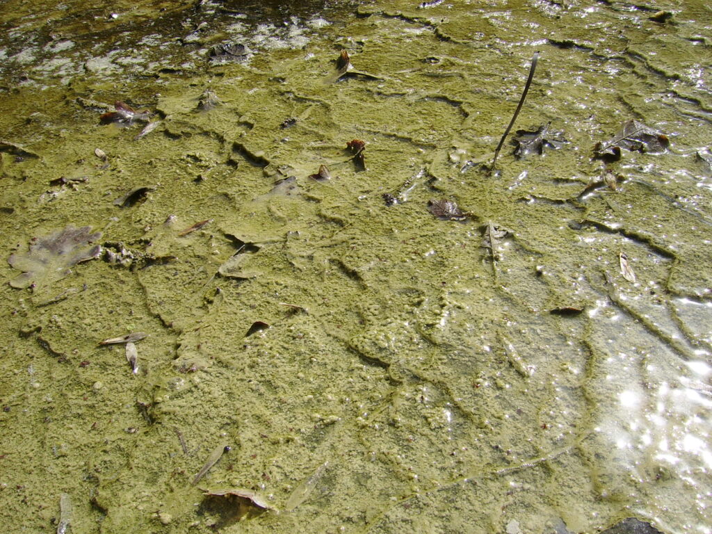 Formation de calcite au fond du cours d’eau à l’émergence de la source de l’Ours dans le Massif Central