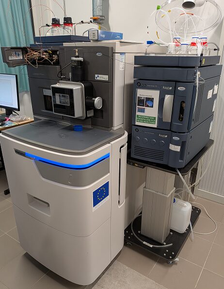 Voici l’un de nos instruments le plus utilisé. On appelle cela une chromatographie liquide ultra haute performance couplée à un spectromètre de masse de haute résolution. C’est le premier instrument sur lequel je me suis faite la main en arrivant, mais aussi celui qui m’a donné le plus de fil à retordre, car il est particulièrement sensible et demande un gros travail de maintenance.